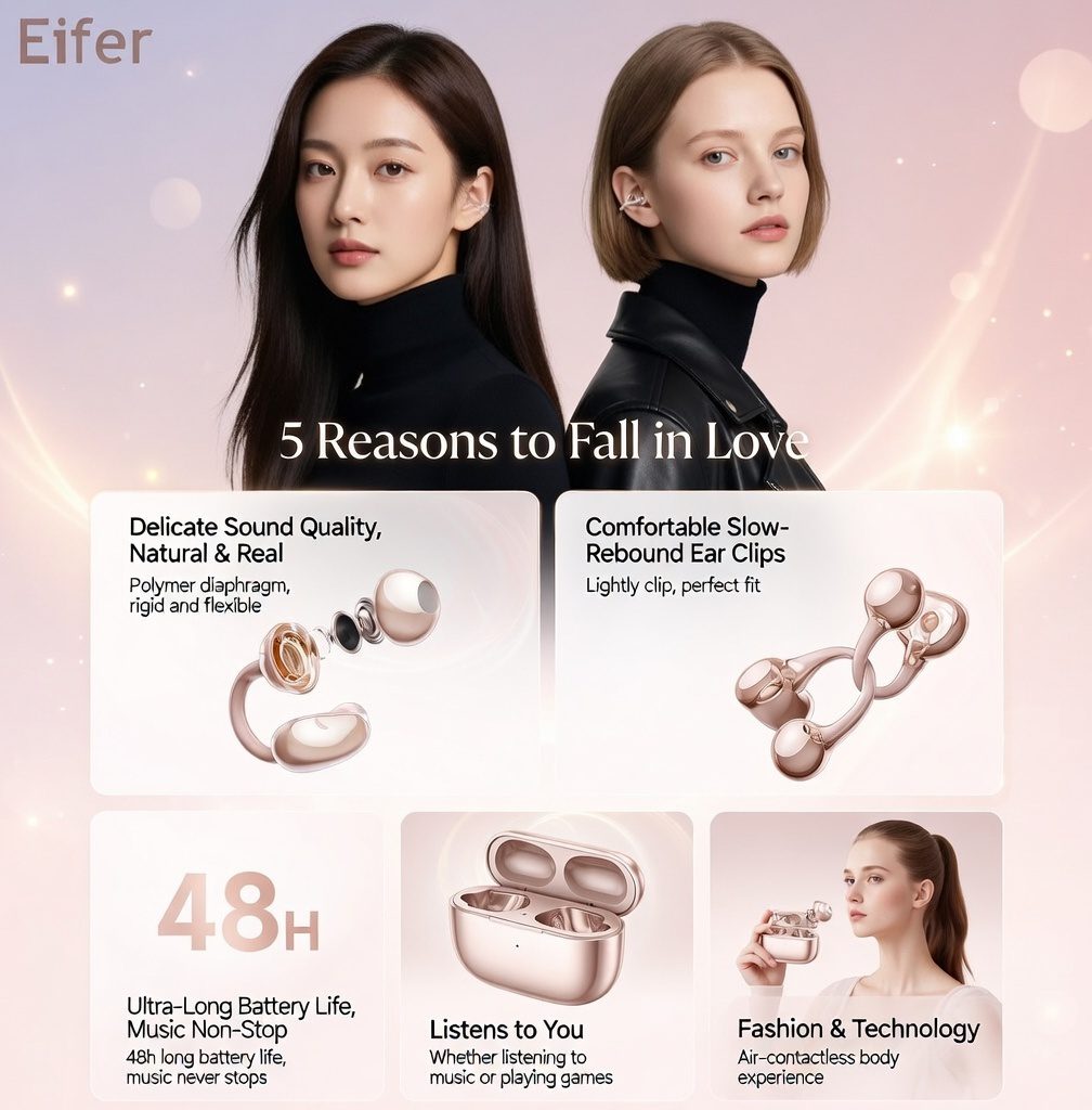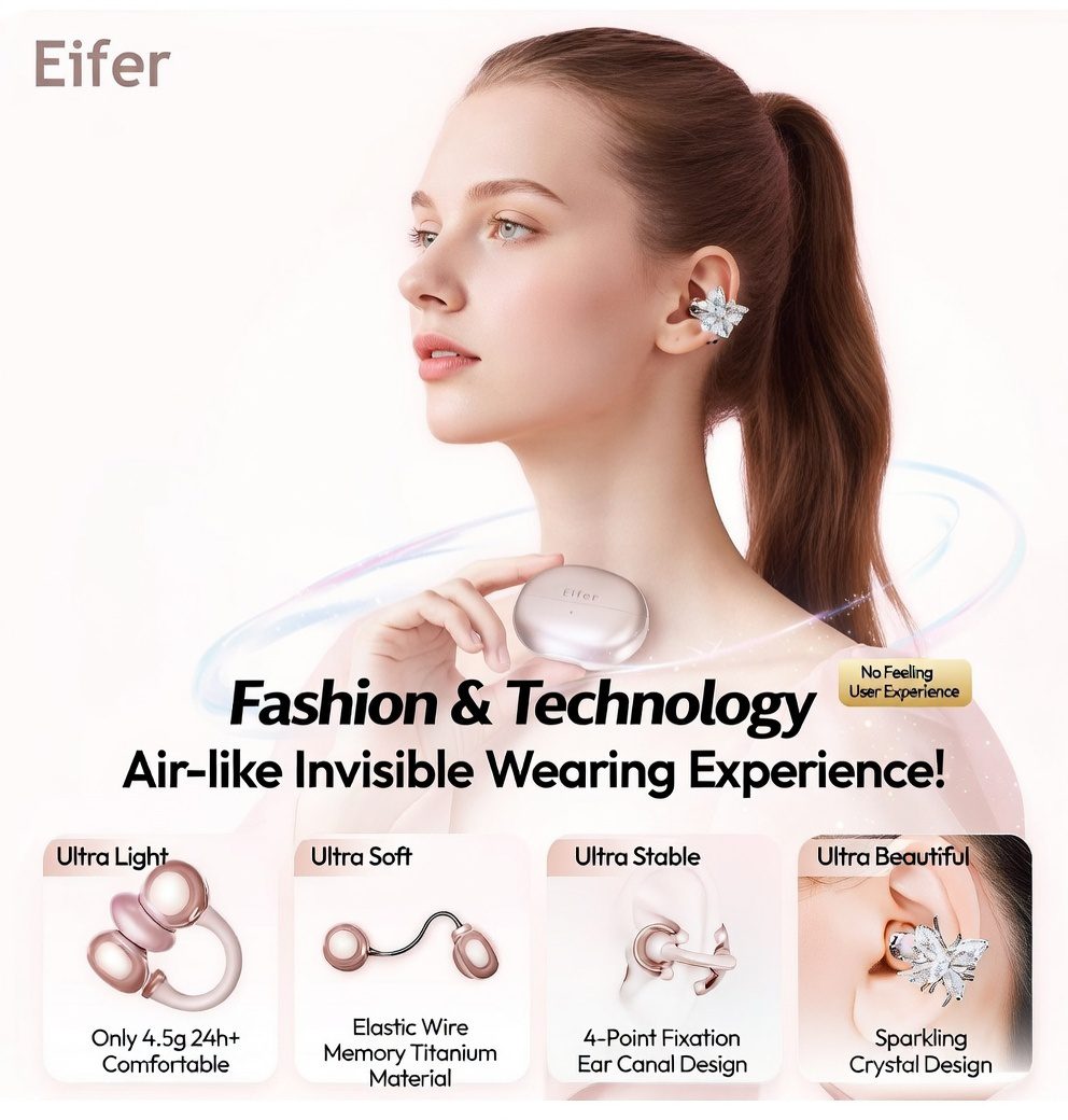 This isn’t just another earbud – it’s a fashion statement disguised as jewelry! Clip-on open-ear design shaped like cute butterfly earrings (with free bow earrings bonus in some variants), so you look fire while listening to your favorite Bangla tracks, K-pop, or study playlists. No in-ear pressure, no blocking your ears – perfect for staying alert during busy Dhaka streets, university lectures, or rickshaw rides.