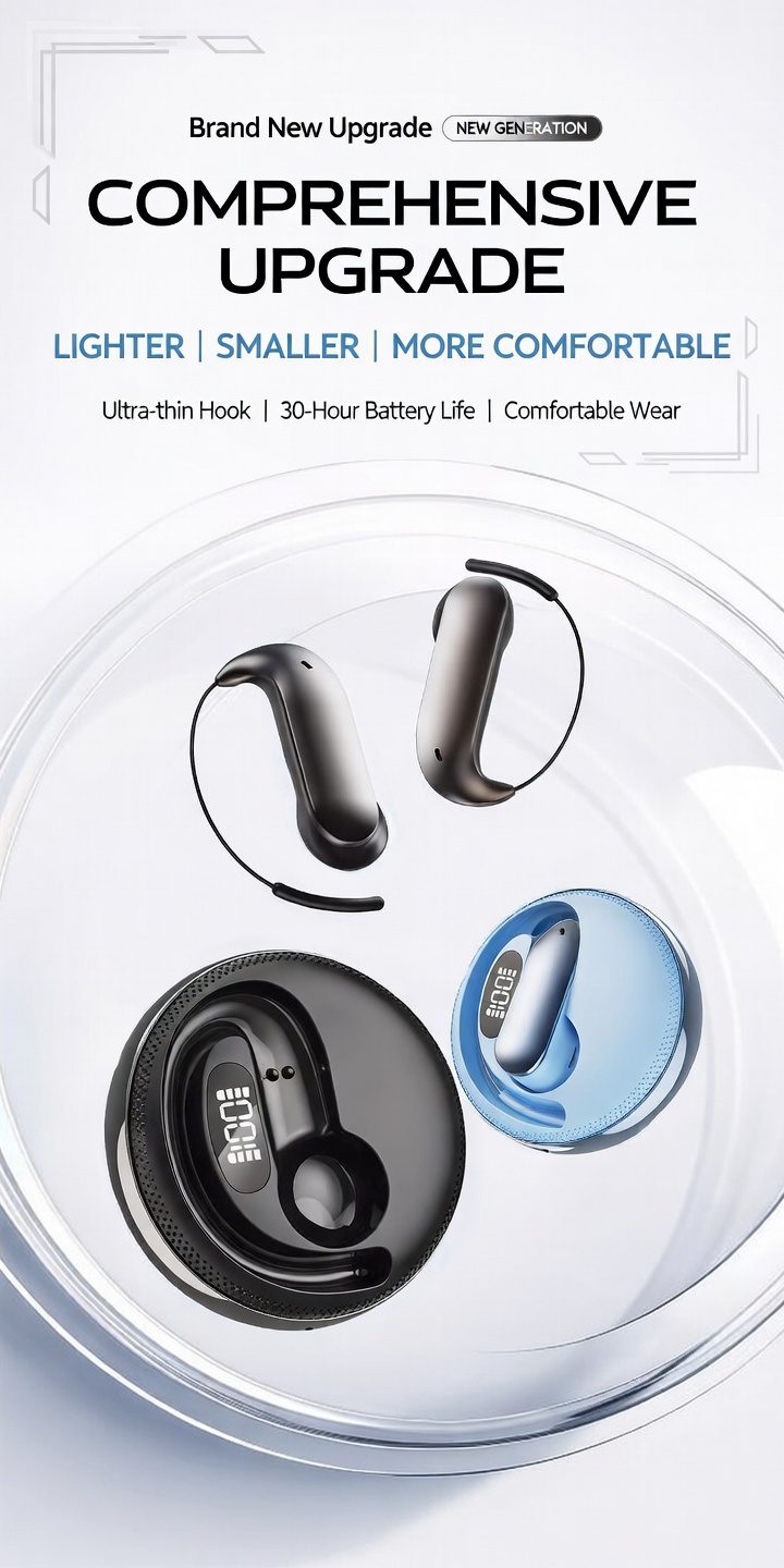 Picture this: crystal-clear calls, booming bass music, and instant real-time language translation — all without blocking your ears. The sleek ear-hook style hugs comfortably for workouts, runs, commutes, or all-day wear, while the charging case features a stunning digital LED display showing battery levels in style (up to 100% glow-up vibes 🔥).